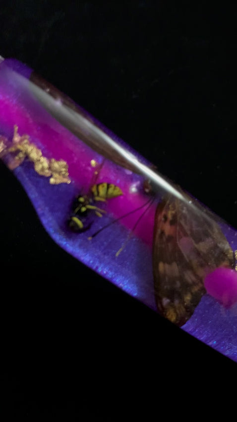 handle: real bee&butterflies cast in epoxy. Purple,gold,pink